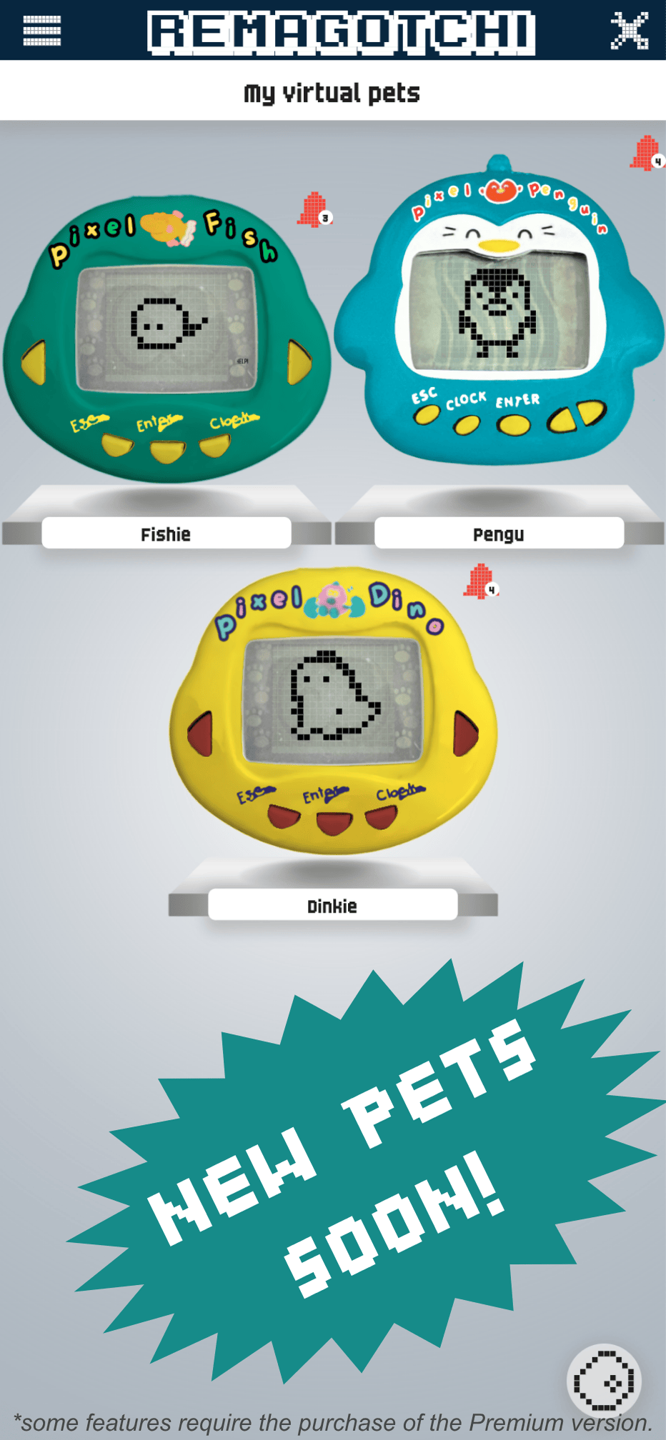 Purchase the premium version and get access to Pixel Fish and other pets that will be gradually added to our App, in addition to other really cool features.